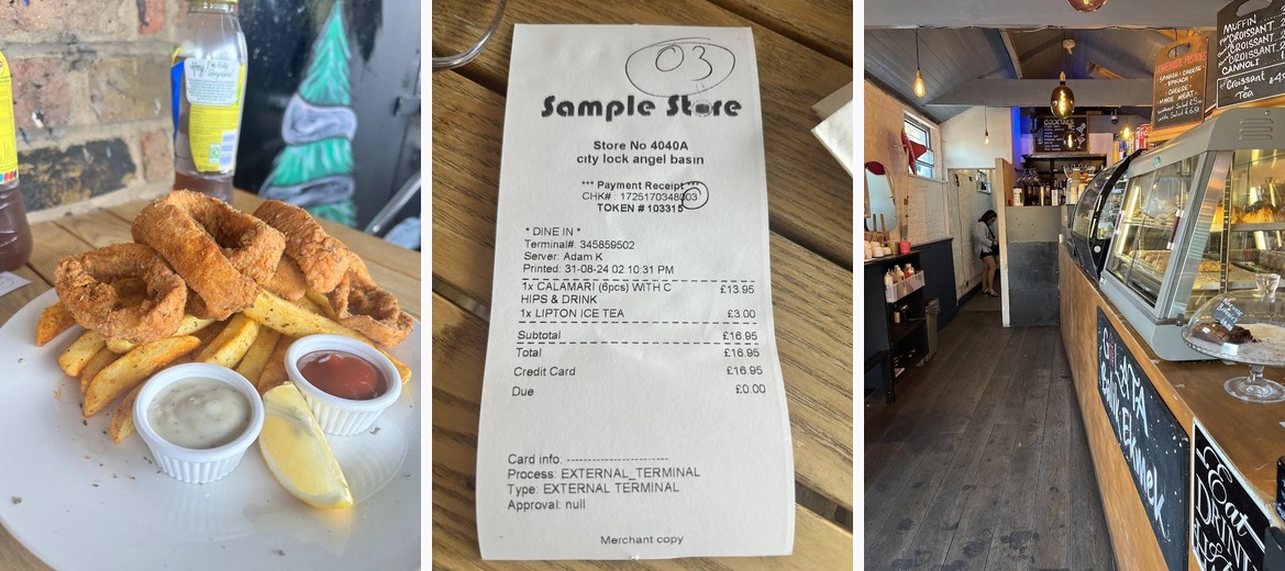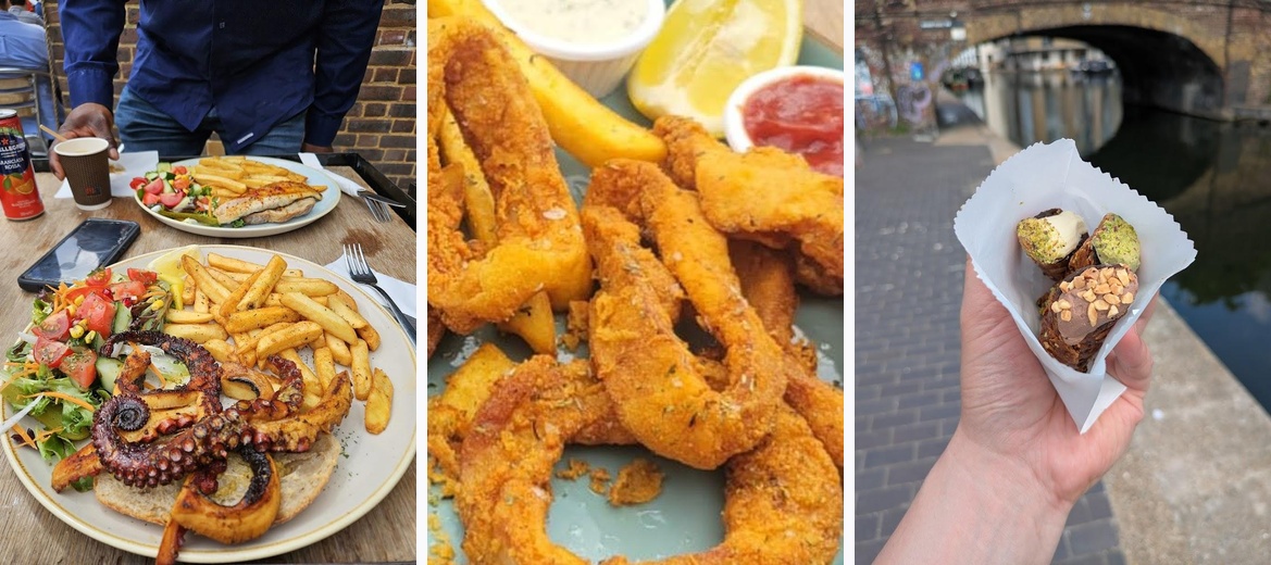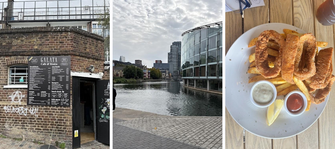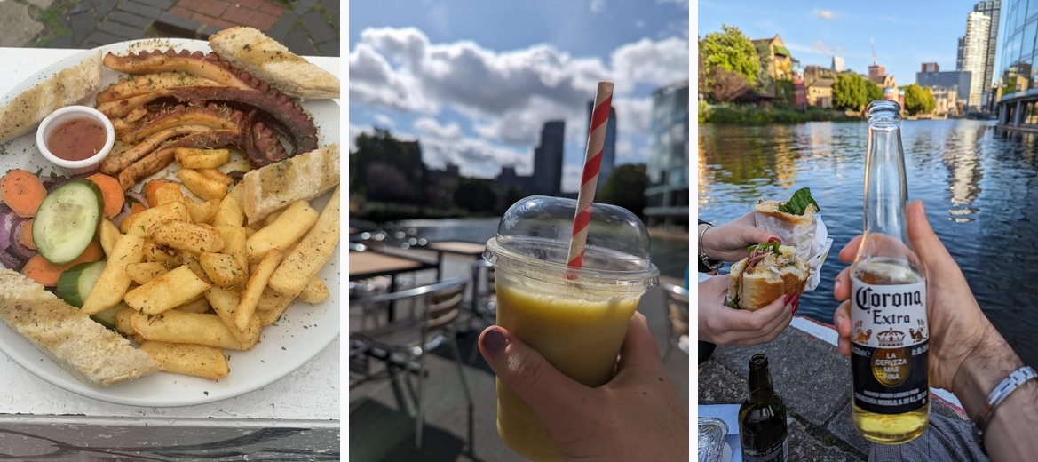 Bar / coffee shop by the canal with seating area outside. Perfect views and the food was delicious (and cheap being in mind we are in London!). We order calamari and were very tasty, soft and spicy. It comes with ketchup and tartare sauce. Also they have available different sauces, like mayonnaise and so… Today the terraza was fine but if the weather is good, they used to be very busy